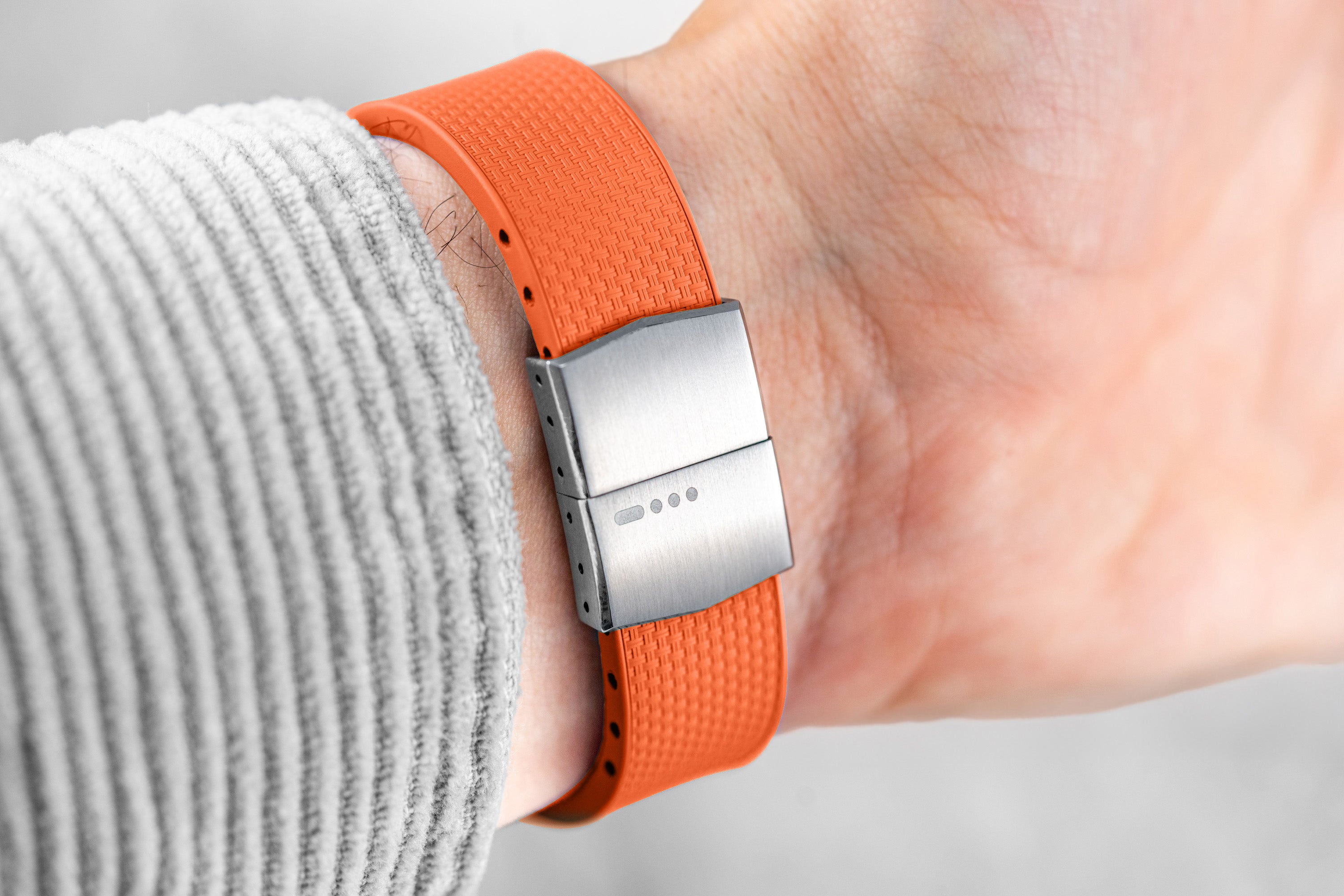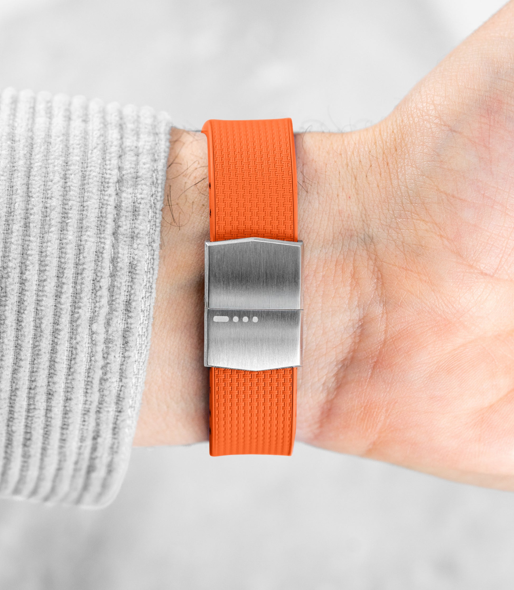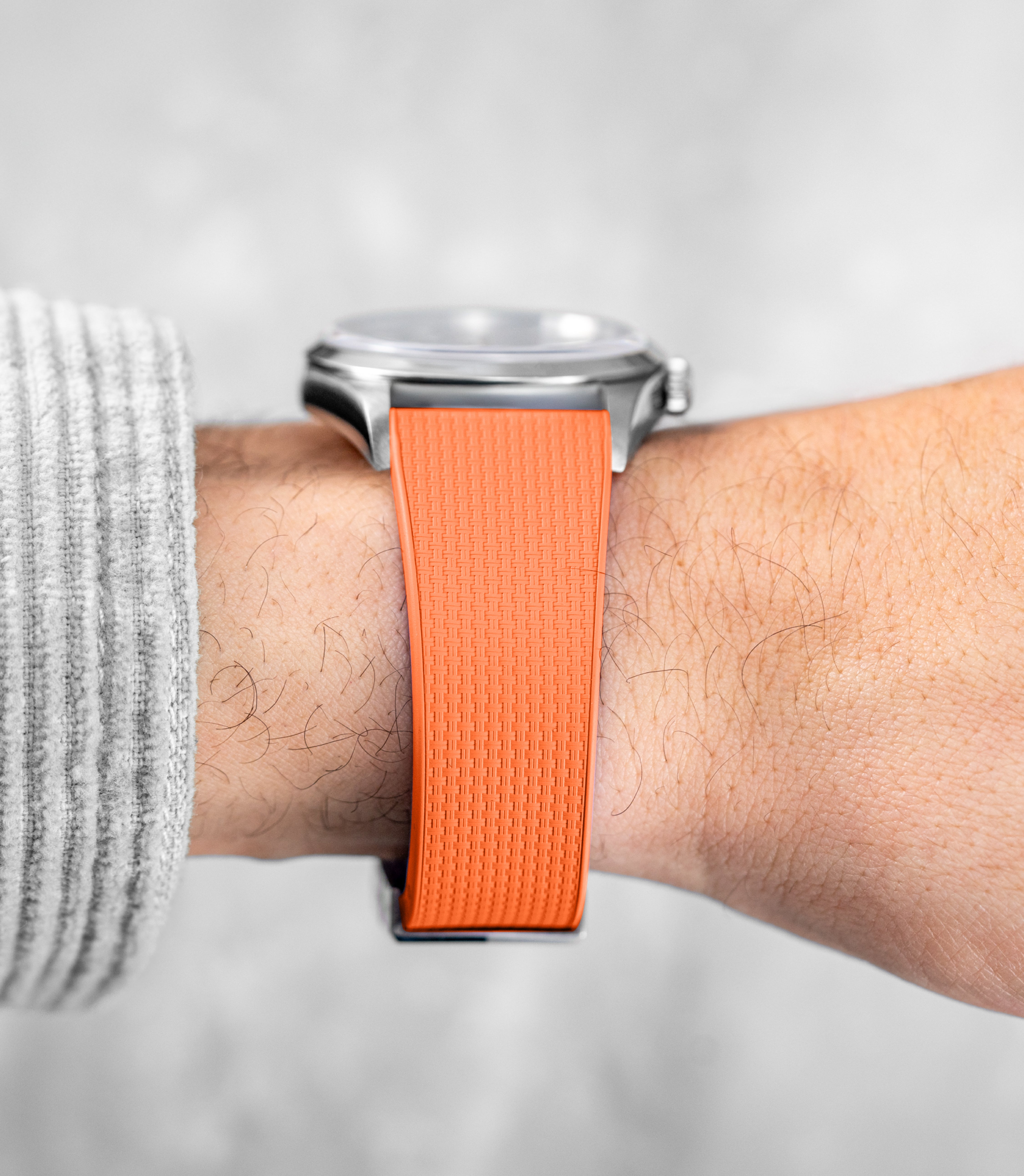 FKM isn’t standard rubber. It’s a high-performance fluoroelastomer chosen for one reason: it lasts. Heat, sweat, UV, salt water — it handles all of it without fading, deforming, or breaking down. Unlike silicone or generic rubber, FKM keeps its shape and color over time. It’s naturally hypoallergenic and sits clean against the skin, even in heat. Dense yet flexible, it delivers that solid, planted feel on the wrist without ever turning soft or sticky.